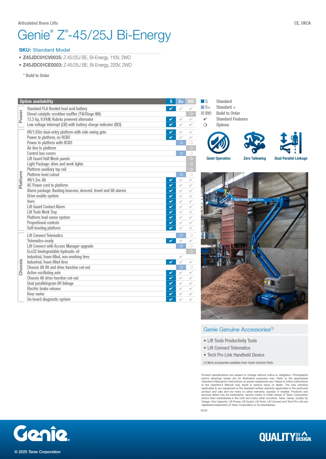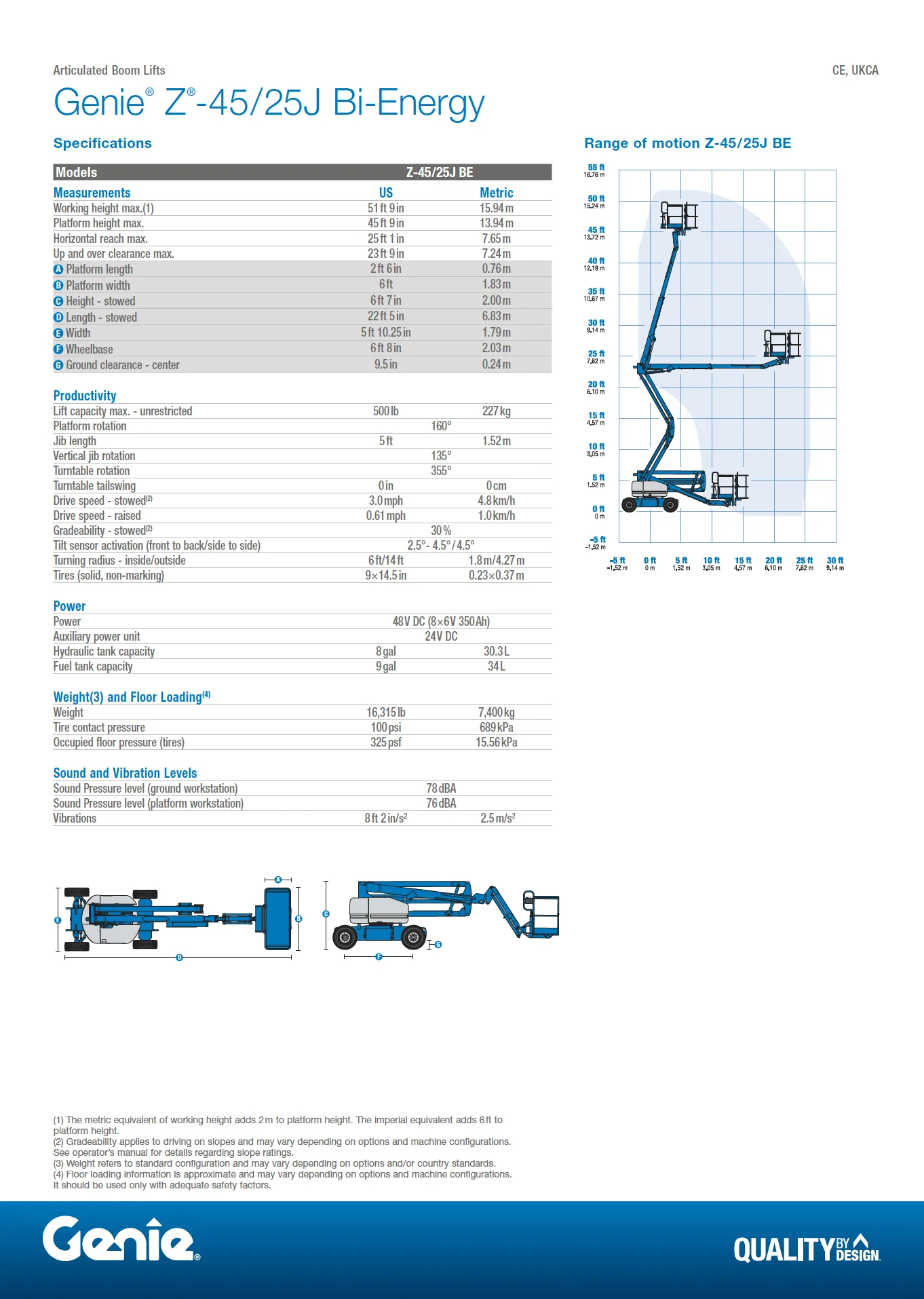 The 15m working height Genie Z45 self-propelled bi-energy powered boom (also referred to as a ‘Cherry Picker’) available from Total Hire and Sales in Derby is compact, versatile and reliable. This self-propelled boom lift is one of the most versatile and reliable machines in its class with excellent manoeuvrability and reach performance it is an ideal all-rounder for indoor and outdoor use.